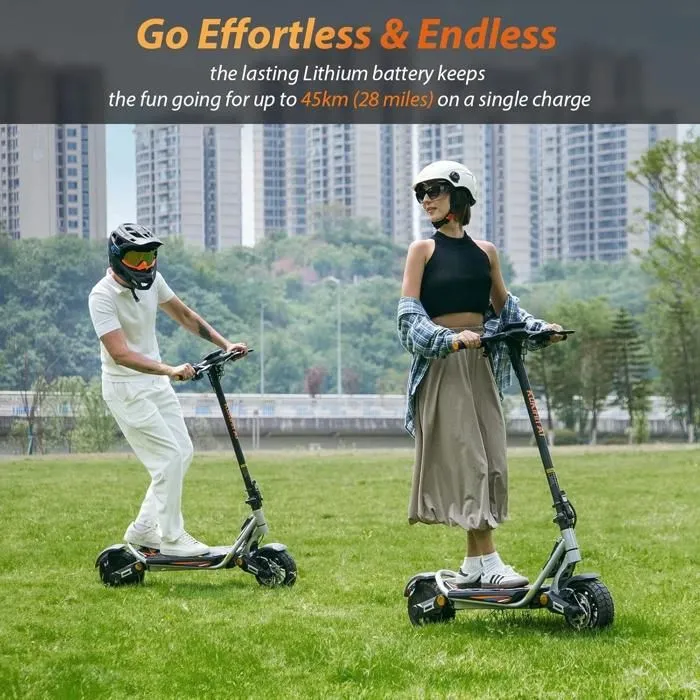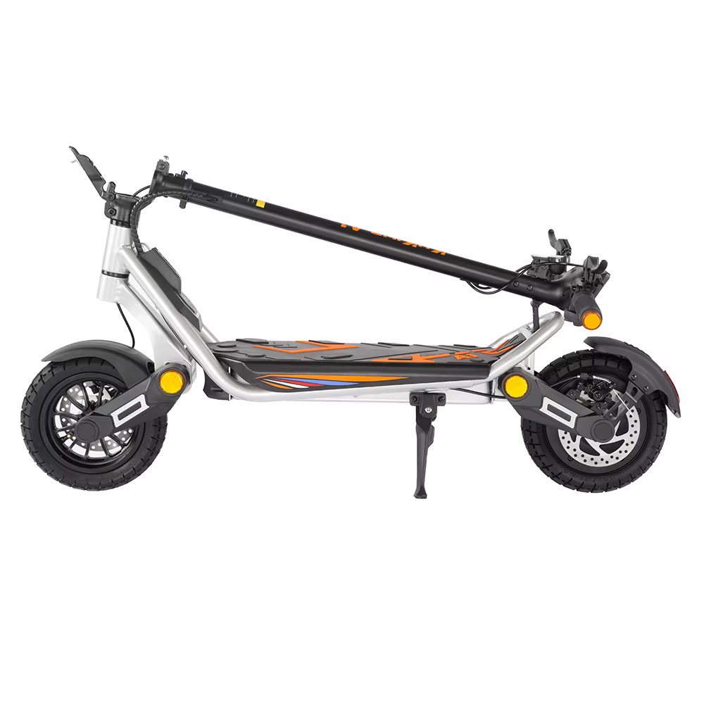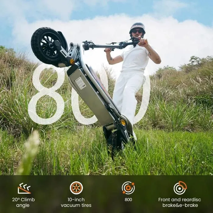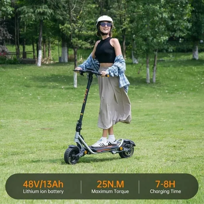 Équipée d'un moteur brushless 800W, d'une batterie 48V 13Ah offrant jusqu'à 45 km d'autonomie, de pneus 10" tout-terrain et d'un système pliable pratique. Certifiée IP54 pour une utilisation par tous les temps.