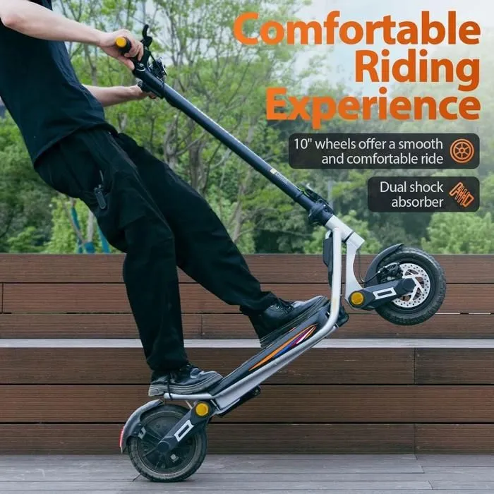 Pneus tubeless 10" tout-terrain, suspension avant et arrière avec amortisseurs en gel haute élasticité — un confort maximum même sur les sols les plus irréguliers.